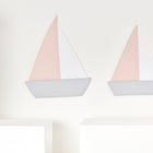Die Segelboote sind zwischen 36 und 42 cm groß, bestehen Aussen aus 100% Baumwolle und sind in der Waschmaschine waschbar. Damit sie stabil und steif an der Wand hängen sind sie von Innen zusätzlich mit leichtem Vlies verstärkt. Inhalt: 2 Segelboote.