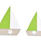 Die Segelboote sind zwischen 36 und 42 cm groß, bestehen Aussen aus 100% Baumwolle und sind in der Waschmaschine waschbar. Damit sie stabil und steif an der Wand hängen sind sie von Innen zusätzlich mit leichtem Vlies verstärkt. Inhalt: 2 Segelboote.